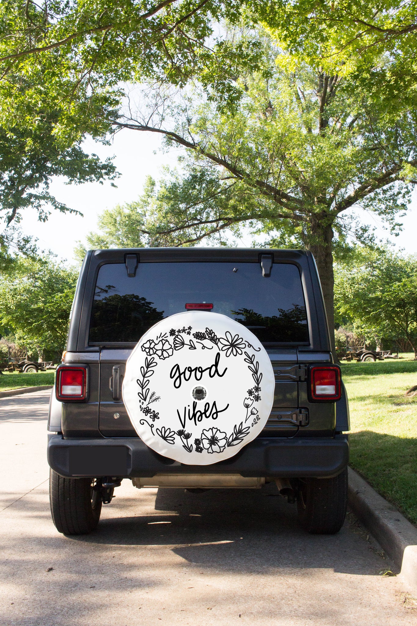 Good Vibes Quote Floral Wreath Tire Cover-The Tire Cover Shop Original Design-Whether you're cruising around town or getting away for the weekend, make your mark with a cute Tire Cover!-Design is professionally printed onto a black vinyl tire cover.-This tire cover is made to fit YOUR tire. Each cover is made to order, and is a unique addition to your vehicle.-Tire covers are exceptional quality, made from heavy-duty marine weight vinyl and a crisp printed design. -Tire cover will withstand weather & car washing!-SIZING: To make sure your tire cover fits perfectly, please provide exact size in the notes section when you check out. Size is printed on your vehicle's tire. Your cover can not be made without this detail, since all covers are made to order. Select "OTHER" at checkout if your size isn't listed.