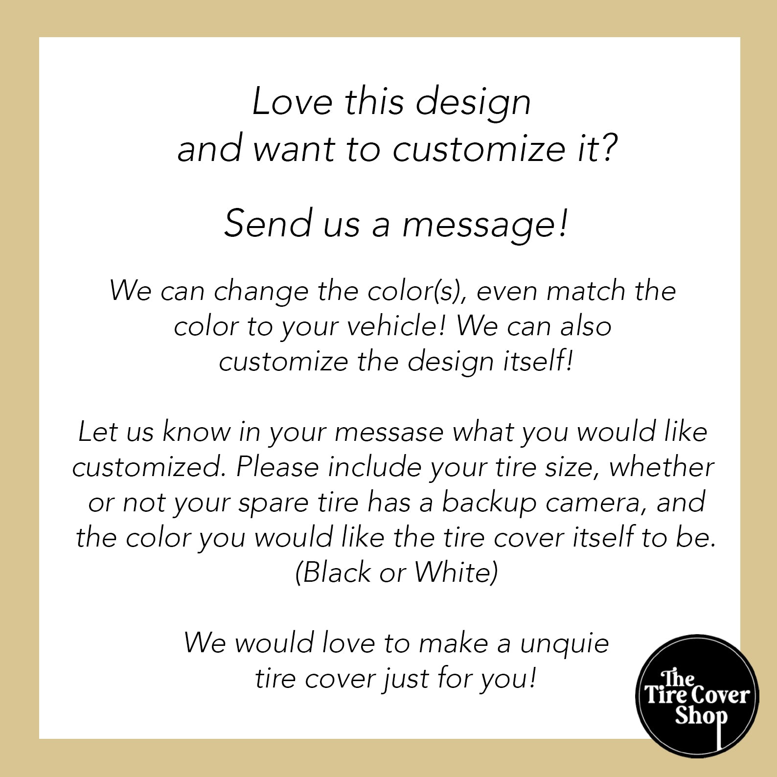 SIZING: To make sure your tire cover fits perfectly, please provide the exact size in the notes section when you check out. Size is printed on your vehicle's tire. Your cover can not be made without this detail, since all covers are made to order. Select "OTHER" at checkout if your size isn't listed.